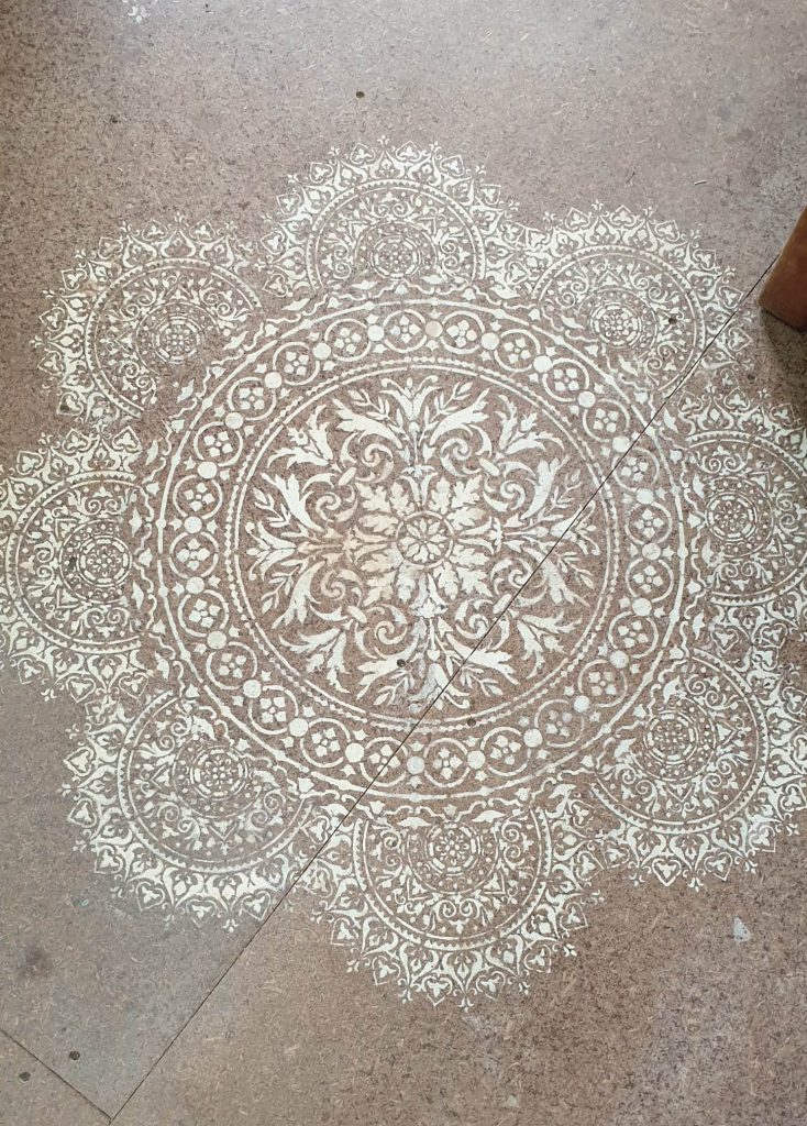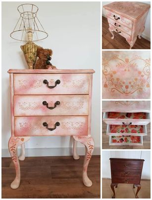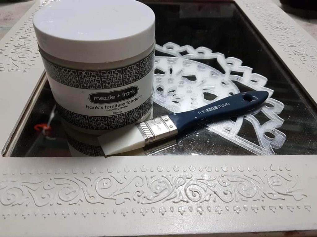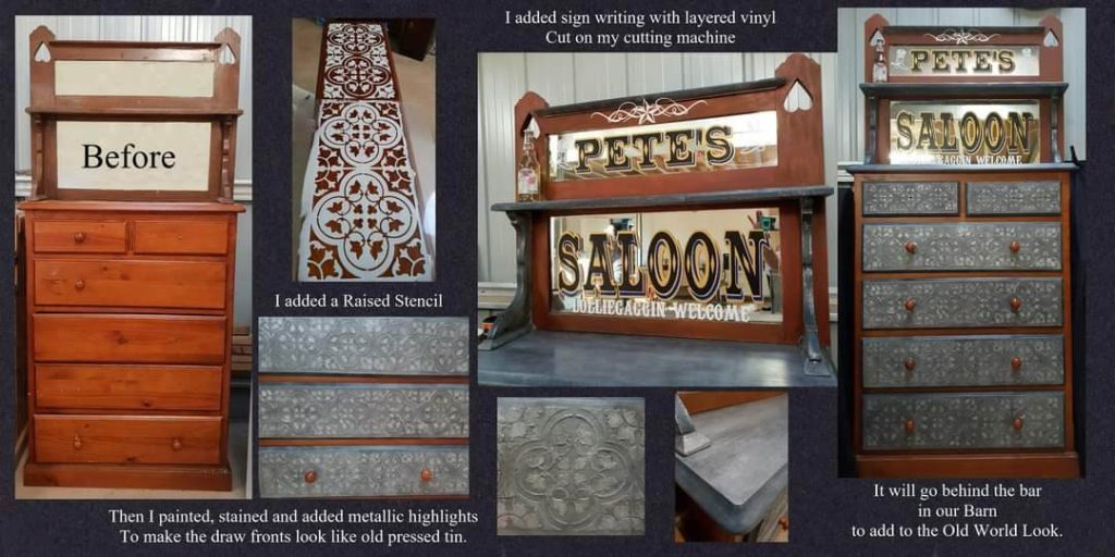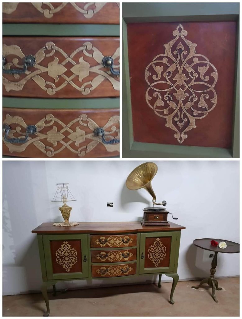I love the look of Stencils. I have the floor in my Studio stencilled and I really like the customization it gives to furniture. When it’s for furniture I cut a think stencil and use texture medium to have a razed embellishment. I cut the stencils on my cutting machine.
